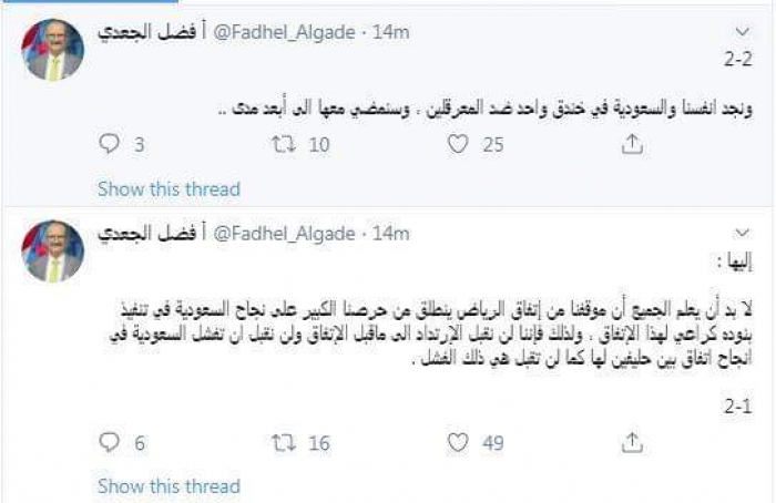 وكتب في تغريدات عبر "تويتر" رصدها "المشهد العربي": "لا بد أن يعلم الجميع أن موقفنا من اتفاق الرياض ينطلق من حرصنا الكبير على نجاح السعودية في تنفيذ بنوده كراعي لهذا الاتفاق، ولذلك فإننا لن نقبل الارتداد إلى ماقبل الاتفاق ولن نقبل أن تفشل السعودية في إنجاح اتفاق بين حليفين لها كما لن تقبل هي ذلك الفشل".