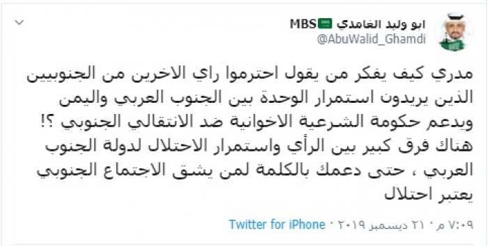 وكتب "الغامدي" في تغريدة عبر حسابه الشخصي بتويتر، رصدها "المشهد العربي": "مدري كيف يفكر من يقول احترموا رأي الاخرين من الجنوبيين الذين يريدون استمرار الوحدة بين الجنوب العربي واليمن ويدعم حكومة الشرعية الإخوانية ضد الانتقالي الجنوبي ؟"!