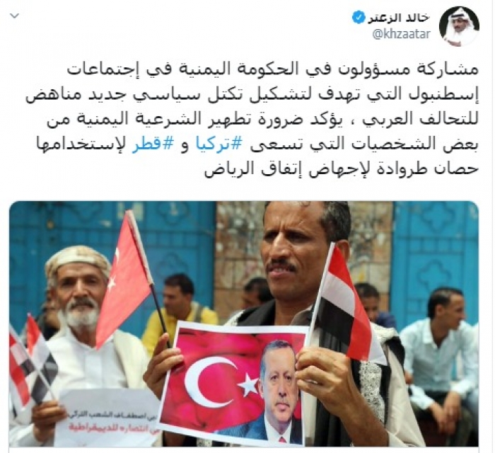 وكتب "الزعتر" في تغريدة عبر حسابه بتويتر، رصدها "المشهد العربي" قال فيها: "مشاركة مسؤولون في الحكومة اليمنية في إجتماعات إسطنبول التي تهدف لتشكيل تكتل سياسي جديد مناهض للتحالف العربي ، يؤكد ضرورة تطهير الشرعية اليمنية من بعض الشخصيات التي تسعى #تركيا و #قطر لاستخدامها حصان طروادة لإجهاض اتفاق الرياض.