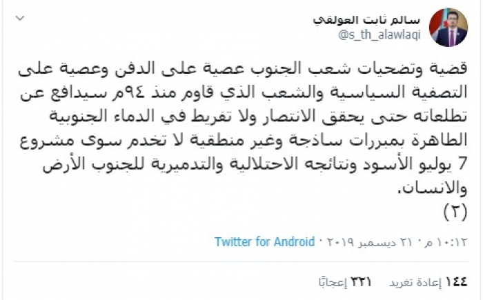وقال "العولقي" في تغريدته: "قضية وتضحيات شعب الجنوب عصية على الدفن وعصية على التصفية السياسية والشعب الذي قاوم منذ ٩٤م سيدافع عن تطلعاته حتى يحقق الانتصار ولا تفريط في الدماء الجنوبية الطاهرة بمبررات ساذجة وغير منطقية لا تخدم سوى مشروع 7 يوليو الأسود ونتائجه الاحتلالية والتدميرية للجنوب الأرض والإنسان".