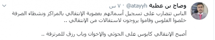وكتب بن عطية عبر تغريدة له على "تويتر" رصدها "المشهد العربي":"الناس تتضارب على تسجيل أسمائهم بعضوية الانتقالي بالمراكز، ونشطاء الصرفة خلصوا الفلوس وقاموا يروجون للاستقالات من الانتقالي".