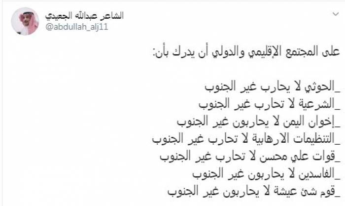 وجه الشاعر عبدالله الجعيدي، اليوم، رسالة هامة إلى المجتمع الإقليمي والدولي بشأن أطماع مليشيات الحوثي والإخوان وحكومة الشرعية في الجنوب.