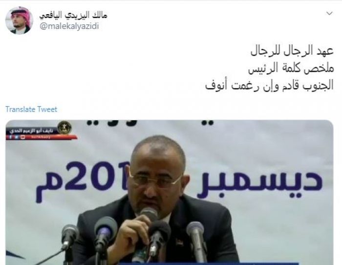 وقال في تغريدة عبر "تويتر" رصدها "المشهد العربي": "عهد الرجال للرجال ملخص كلمة الرئيس الجنوب قادم وإن رغمت أنوف".