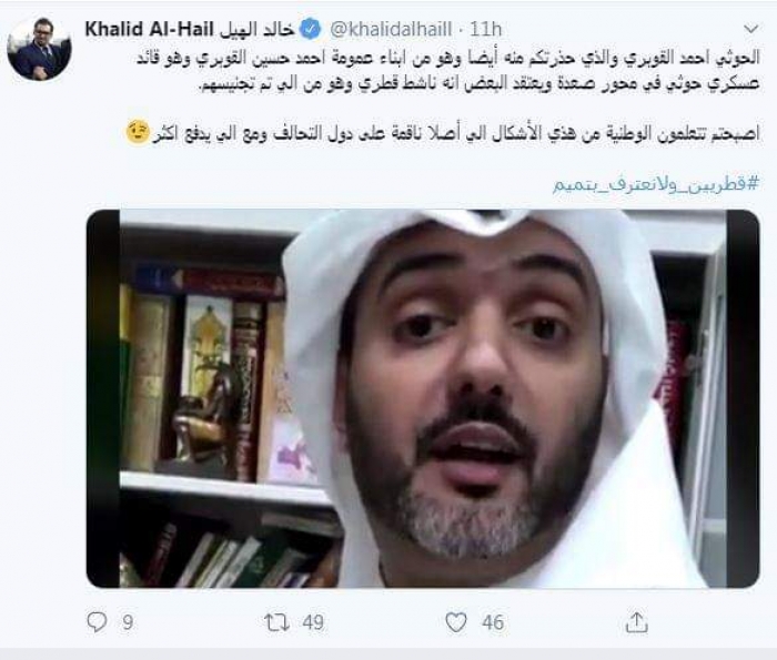 وقال في تغريدة عبر "تويتر" رصدها "المشهد العربي": "الحوثي أحمد القوبري والذي حذرتكم منه أيضًا وهو من أبناء عمومه أحمد حسين القوبري وهو قائد عسكري حوثي في محور صعدة ويعتقد البعض أنه ناشط قطري وهو من اللي تم تجنيسهم".