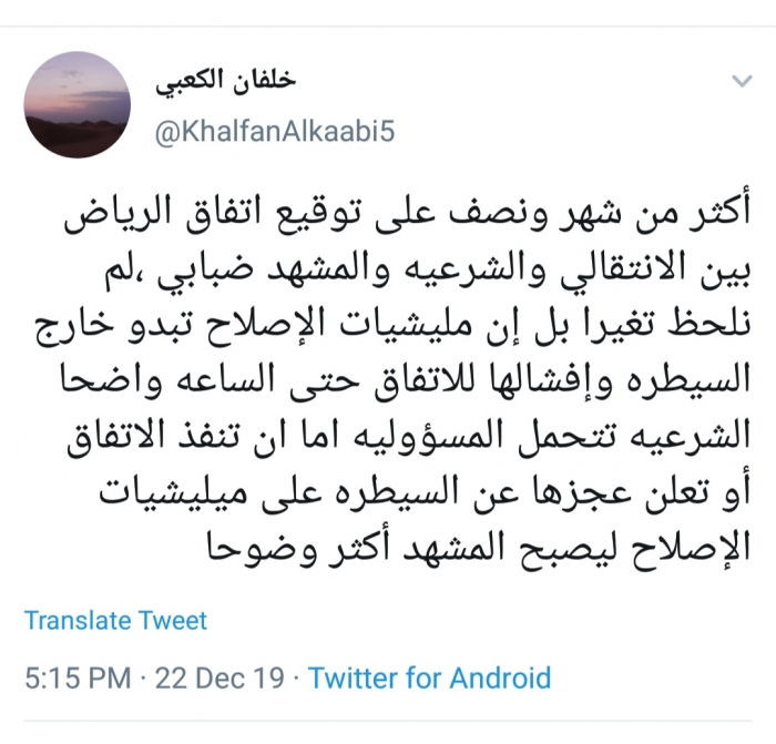 وكتب الكعبي، في تغريدة له عبر موقع التواصل الاجتماعي تويتر، تابعها المشهد العربي: "أكثر من شهر ونصف على توقيع اتفاق الرياض بين الانتقالي والشرعية والمشهد ضبابي".