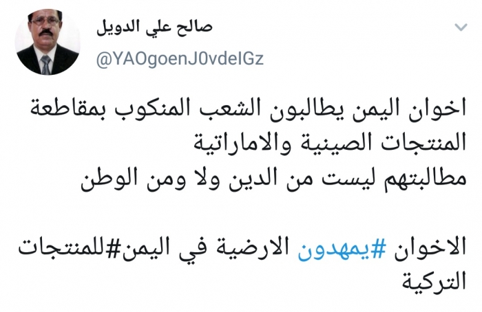 وكتب الدويل، في تغريدة له عبر موقع التواصل الاجتماعي تويتر، تابعها المشهد العربي: "إخوان اليمن يطالبون الشعب المنكوب بمقاطعة المنتجات الصينية والاماراتية"، مؤكدا: "مطالبتهم ليست من الدين ولا ومن الوطن".