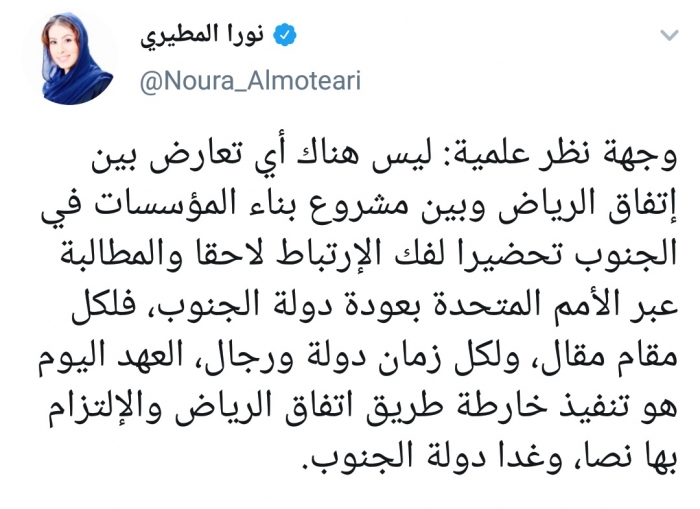 وكتبت المطيري، في تغريدة لها عبر موقع التواصل الاجتماعي تويتر، تابعها المشهد العربي: "ليس هناك أي تعارض بين اتفاق الرياض وبين مشروع بناء المؤسسات في الجنوب تحضيرا لفك الارتباط لاحقا والمطالبة عبر الأمم المتحدة بعودة دولة الجنوب".