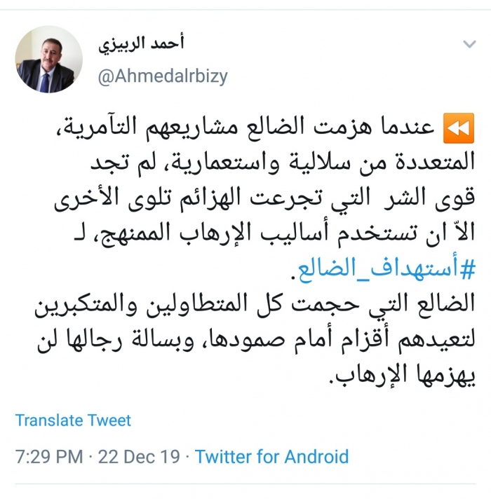 وكتب الربيزي، في تغريدة له على موقع التواصل الاجتماعي تويتر، تابعها المشهد العربي: "عندما هزمت الضالع مشاريعهم التآمرية، المتعددة من سلالية واستعمارية، لم تجد قوى الشر التي تجرعت الهزائم تلوى الأخرى إلاّ أن تستخدم أساليب الإرهاب الممنهج، لـ استهداف الضالع".
