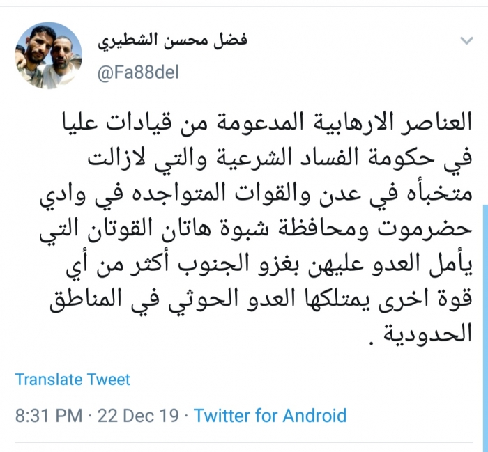وكتب الشطيري، في تغريدة له على موقع التواصل الاجتماعي تويتر، تابعها المشهد العربي: "العناصر الإرهابية المدعومة من قيادات عليا في حكومة الفساد الشرعية والتي لازالت متخبأه في عدن والقوات المتواجدة في وادي حضرموت ومحافظة شبوة هاتان القوتان التي يأمل العدو عليهما بغزو الجنوب أكثر من أي قوة أخرى يمتلكها العدو الحوثي في المناطق الحدودية".