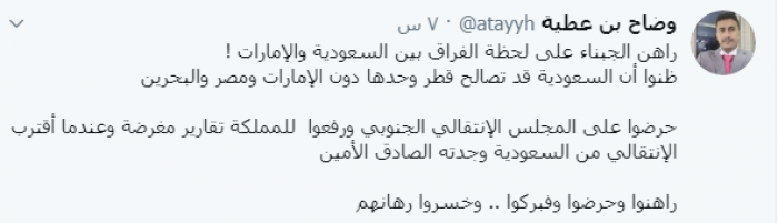 وكتب بن عطية عبر تغريدة له على "تويتر":"راهن الجبناء على لحظة الفراق بين السعودية والإمارات،ظنوا أن السعودية قد تصالح قطر وحدها دون الإمارات ومصر والبحرين".