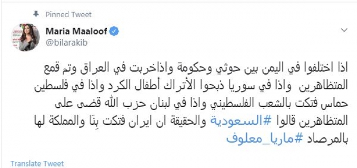 وكتبت في تغريدة عبر "تويتر" رصدها "المشهد العربي": "إذا اختلفوا في اليمن بين حوثي وحكومة وإذا خربت في العراق وتم قمع المتظاهرين وإذا في سوريا ذبحوا الأتراك أطفال الكرد واذا في فلسطين حماس فتكت بالشعب الفلسطيني واذا في لبنان حزب الله قضى على المتظاهرين قالوا السعودية والحقيقة إن إيران فتكت بِنَا والمملكة لها بالمرصاد".