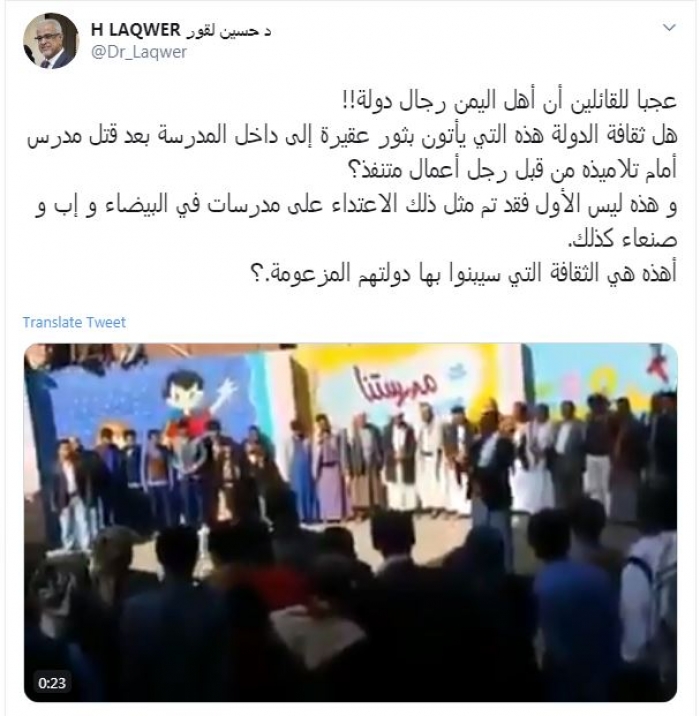 وقال في تغريدة عبر "تويتر" رصدها "المشهد العربي": "عجبا للقائلين أن أهل اليمن رجال دولة.. هل ثقافة الدولة هذه التي يأتون بثور عقيرة إلى داخل المدرسة بعد قتل مدرس أمام تلاميذه من قبل رجل أعمال متنفذ؟".