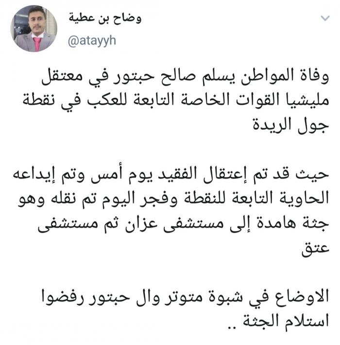 وكتب بن عطية، في تغريدة له عبر موقع التواصل الاجتماعي تويتر، تابعها المشهد العربي: "وفاة المواطن يسلم صالح حبتور في معتقل مليشيا القوات الخاصة التابعة للعكب في نقطة جول الريدة، حيث تم اعتقال الفقيد يوم أمس وتم إيداعه الحاوية التابعة للنقطة وفجر اليوم تم نقله وهو جثة هامدة إلى مستشفى عزان ثم مستشفى عتق".