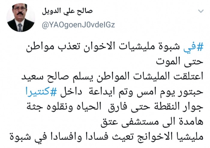 وكتب الدويل، في تغريدة له عبر موقع التواصل الاجتماعي تويتر، تابعها المشهد العربي: "في شبوة مليشيات الإخوان تعذب مواطن حتى الموت".