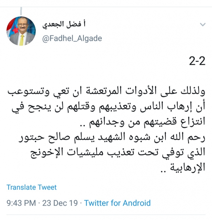 وأضاف: "رحم الله ابن شبوة الشهيد يسلم صالح حبتور الذي توفي تحت تعذيب مليشيات الإخونج الإرهابية".