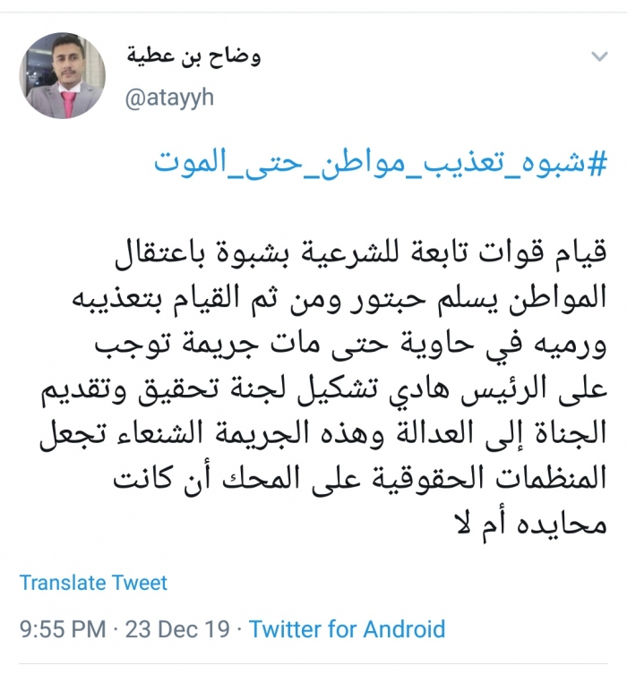 تفاعل عضو الجمعية الوطنية الجنوبية وضاح بن عطية، مع هاشتاج "شبوه تعذيب مواطن حتى الموت"، مطالبا الرئيس اليمني عبد ربه منصور هادي، بتشكيل لجنة تحقيق وتقديم الجناة إلى العدالة.