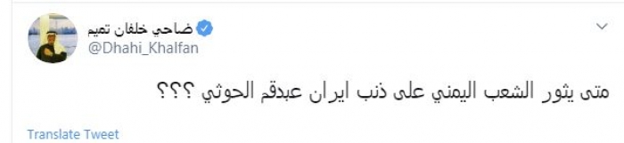 وقال في تغريدة عبر "تويتر" رصدها "المشهد العربي": "متى يثور الشعب اليمني على ذنب إيران عبدقم الحوثي".