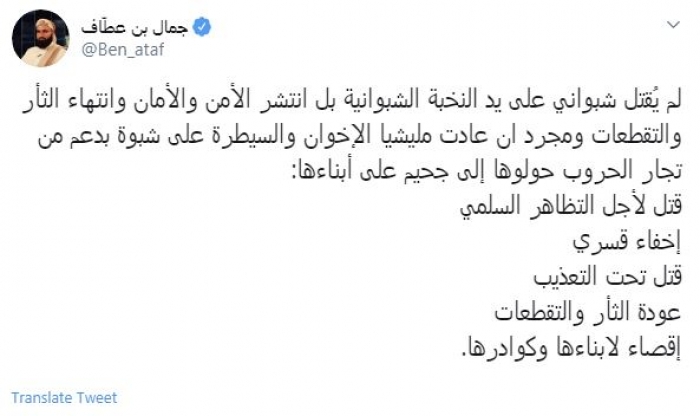 وكتب في تغريدة عبر "تويتر" رصدها "المشهد العربي": "لم يُقتل شبواني على يد النخبة الشبوانية بل انتشر الأمن والأمان وانتهاء الثأر والتقطعات ومجرد ان عادت مليشيا الإخوان والسيطرة على شبوة بدعم من تجار الحروب حولوها إلى جحيم على أبناءها: قتل لأجل التظاهر السلمي.. إخفاء قسري.. قتل تحت التعذيب.. عودة الثأر والتقطعات.. إقصاء لأبنائها وكوادرها".