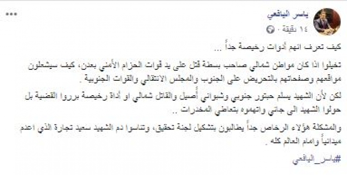 وأضاف: "لكن لأن الشهيد يسلم حبتور جنوبي وشبواني أًصيل والقاتل شمالي أو أداة رخيصة برروا القضية بل حولوا الشهيد إلى جاني واتهموه بتعاطي المخدرات".