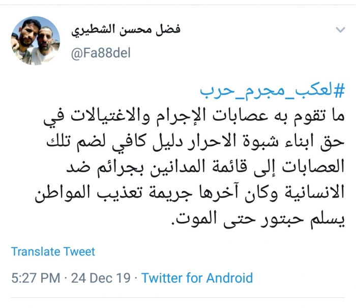 تفاعل رئيس دائرة الشباب بالمجلس الانتقالي الجنوبي فضل محسن الشطيري، مع هاشتاج "لعكب مجرم حرب"، للمطالبة بتطهير شبوة من مليشيات الإخوان التابعة للشرعية.