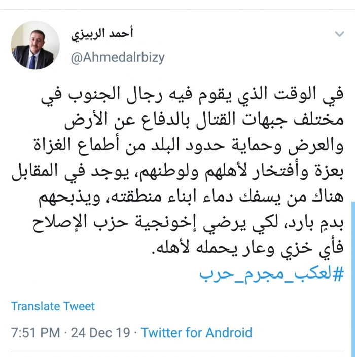 وكتب الربيزي، في تغريدة له على موقع التواصل الاجتماعي تويتر، تابعها المشهد العربي: "في الوقت الذي يقوم فيه رجال الجنوب في مختلف جبهات القتال بالدفاع عن الأرض والعرض وحماية حدود البلد من أطماع الغزاة بعزة وأفتخار لأهلهم ولوطنهم، يوجد في المقابل هناك من يسفك دماء أبناء منطقته، ويذبحهم بدمٍ بارد، لكي يرضي إخونجية حزب الإصلاح".