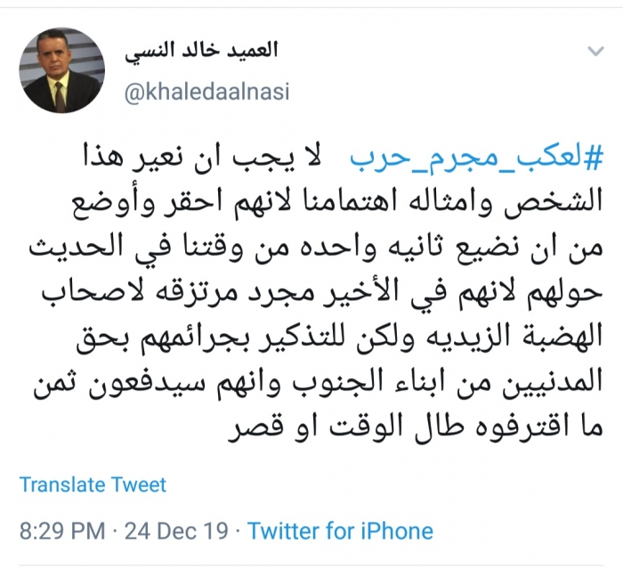 وكتب النسي، في تغريدة له على موقع التواصل الاجتماعي، تويتر، تابعها المشهد العربي: "لا يجب أن نعير هذا الشخص وأمثاله اهتمامنا لأنهم أحقر وأوضع من أن نضيع ثانية واحدة من وقتنا في الحديث حولهم لأنهم في الأخير مجرد مرتزقة لأصحاب الهضبة الزيدية".