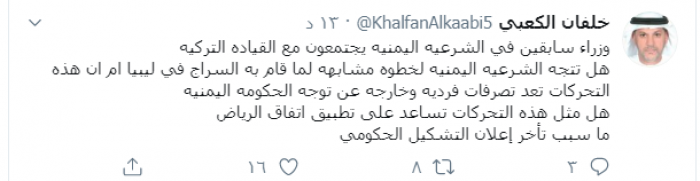 وكتب الكعبي عبر "تويتر":" وزراء سابقين في الشرعية اليمنية يجتمعون مع القيادة التركية،هل تتجه الشرعية اليمنية لخطوة مشابهه لما قام به السراج في ليبيا".