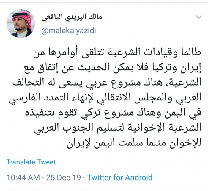وكتب اليافعي، في تغريدة له عبر موقع التواصل الاجتماعي تويتر، تابعها المشهد العربي: "طالما وقيادات الشرعية تتلقى أوامرها من إيران وتركيا فلا يمكن الحديث عن اتفاق مع الشرعية".