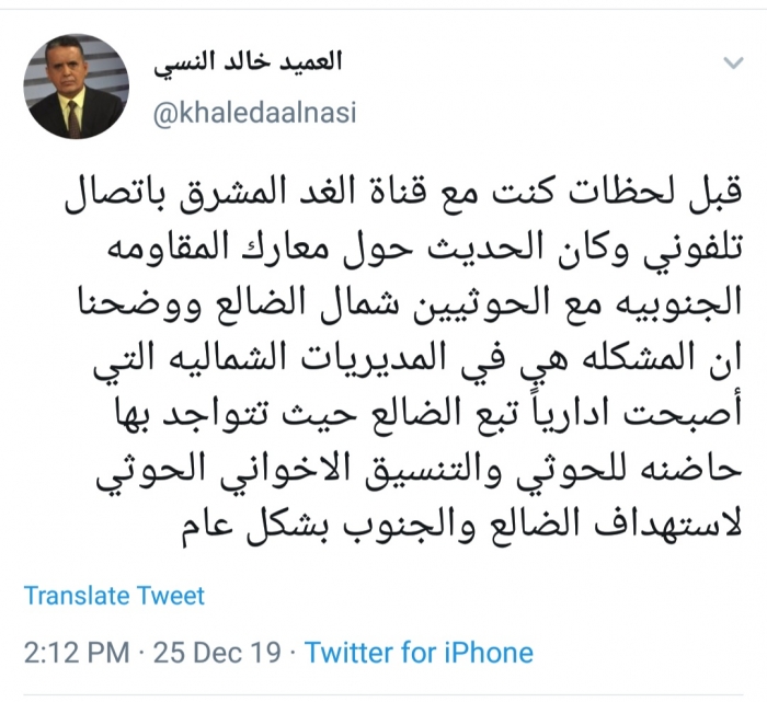 وكتب النسي، في تغريدة له عبر موقع التواصل الاجتماعي تويتر، تابعها المشهد العربي: "قبل لحظات كنت مع قناة الغد المشرق باتصال تلفوني وكان الحديث حول معارك المقاومة الجنوبية مع الحوثيين شمال الضالع ووضحنا أن المشكلة هي في المديريات الشمالية التي أصبحت إدارياً تبع الضالع حيث تتواجد بها حاضنة للحوثي".