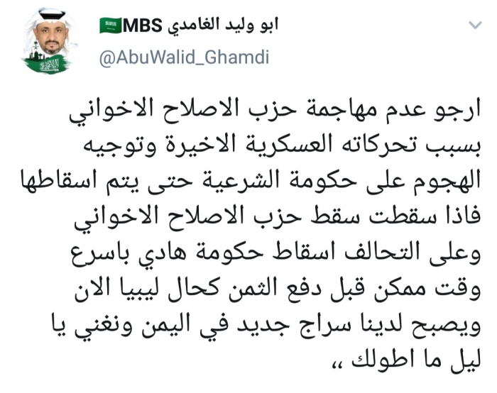 وكتب الغامدي، في تغريدة له عبر موقع التواصل الاجتماعي تويتر، تابعها المشهد العربي: "أرجو عدم مهاجمة حزب الإصلاح الاخواني بسبب تحركاته العسكرية الأخيرة وتوجيه الهجوم على حكومة الشرعية حتى يتم إسقاطها".