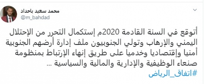 توقع مدير مكتب العميد أحمد محمد بامعلم عضو هيئة رئاسة المجلس الانتقالي الجنوبي، محمد سعيد باحداد، اليوم، استعادة الجنوبيين لدولتهم في عام 2020م.