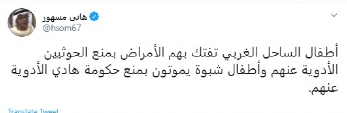 وقال في تغريدة عبر "تويتر" رصدها "المشهد العربي": "أطفال الساحل الغربي تفتك بهم الأمراض بمنع الحوثيين الأدوية عنهم وأطفال شبوة يموتون بمنع حكومة هادي الأدوية عنهم".