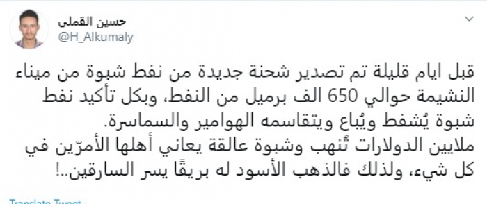 وقال في تغريدة عبر "تويتر" رصدها "المشهد العربي": "قبل أيام قليلة تم تصدير شحنة جديدة من نفط شبوة من ميناء النشيمة حوالي 650 ألف برميل من النفط، وبكل تأكيد نفط شبوة يُشفط ويُباع ويتقاسمه الهوامير والسماسرة. ملايين الدولارات تُنهب وشبوة عالقة يعاني أهلها الأمرّين في كل شيء، ولذلك فالذهب الأسود له بريقًا يسر السارقين".