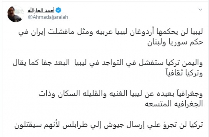 توقع عميد الصحافة الكويتية ورئيس تحرير صحيفة السياسة الكويتية أحمد الجارالله، فشل الرئيس التركي رجب طيب أردوغان في حكم ليبيا، وذلك على غرار فشلّ إيران في حكم سوريا ولبنان واليمن.