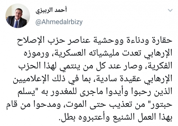 وكتب الربيزي، في تغريدة له على موقع التواصل الاجتماعي تويتر، تابعها المشهد العربي: "حقارة ودناءة ووحشية عناصر حزب الإصلاح الإرهابي تعدت مليشياته العسكرية، ورموزه الفكرية".