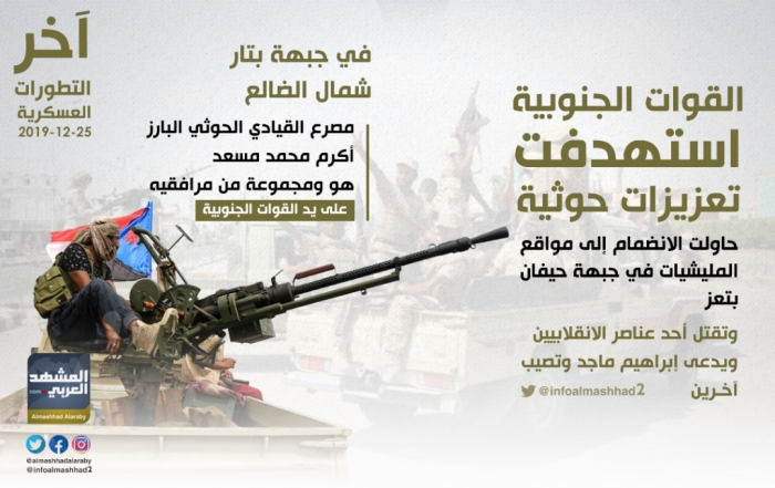 لقي قيادي حوثي بارز مصرعه مع مجموعة من مرافقيه، بنيران القوات الجنوبية في جبهة بتار شمالي الضالع، فيما تمكنت القوات الجنوبية من استهداف تعزيزات عسكرية حاولت الانضمام إلى المليشيات بجبهة حيفان بتعز.