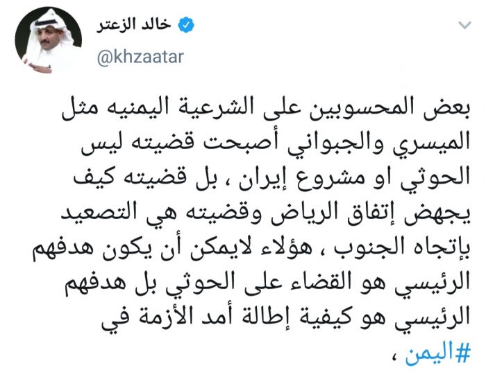 وكتب الزعتر، في تغريدة له عبر موقع التواصل الاجتماعي تويتر، تابعها المشهد العربي: "بعض المحسوبين على الشرعية اليمنية مثل الميسري والجبواني أصبحت قضيته ليس الحوثي أو مشروع إيران، بل قضيته كيف يجهض اتفاق الرياض وقضيته هي التصعيد باتجاه الجنوب".