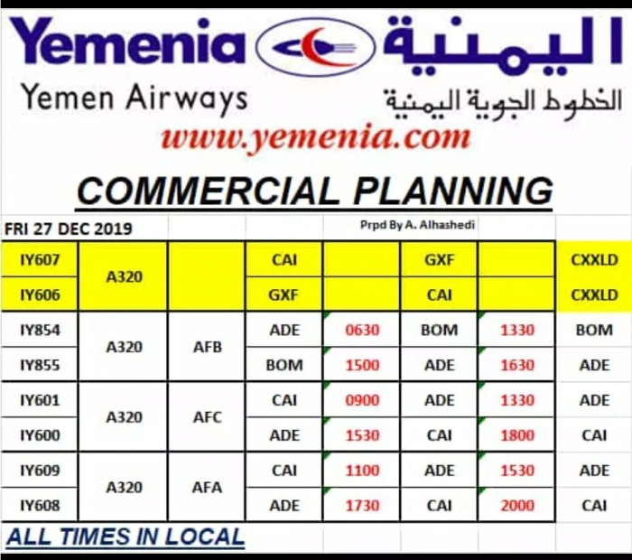 وينشر " المشهد العربي "جدول ومواعيد رحلات طيران اليمنية غدا الجمعة، الموافق 26 ديسمبر 2019.