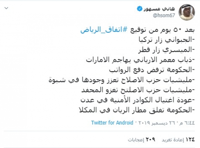وكتب "مسهور" في تغريدة عبر حسابه الشخصي بتويتر، رصدها "المشهد العربي":