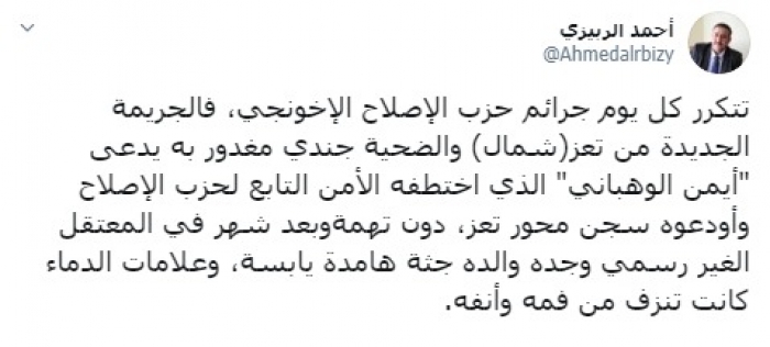 وأضاف: "فالجريمة الجديدة من تعز(شمال) والضحية جندي مغدور به يدعى "أيمن الوهباني" الذي اختطفه الأمن التابع لحزب الإصلاح وأودعوه سجن محور تعز، دون تهمة".