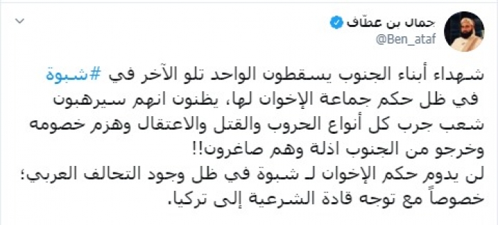 وقال "بن عطاف في تغريدة عبر حسابه بتويتر، رصدها "المشهد العربي": "شهداء أبناء الجنوب يسقطون الواحد تلو الآخر في #شبوة في ظل حكم جماعة الإخوان لها".