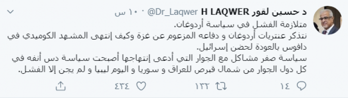 وكتب لقور عبر "تويتر":"متلازمة الفشل في سياسة أردوغان،نتذكر عنتريات أردوغان و دفاعه المزعوم عن غزة وكيف انتهى المشهد الكوميدي في دافوس بالعودة لحضن إسرائيل".