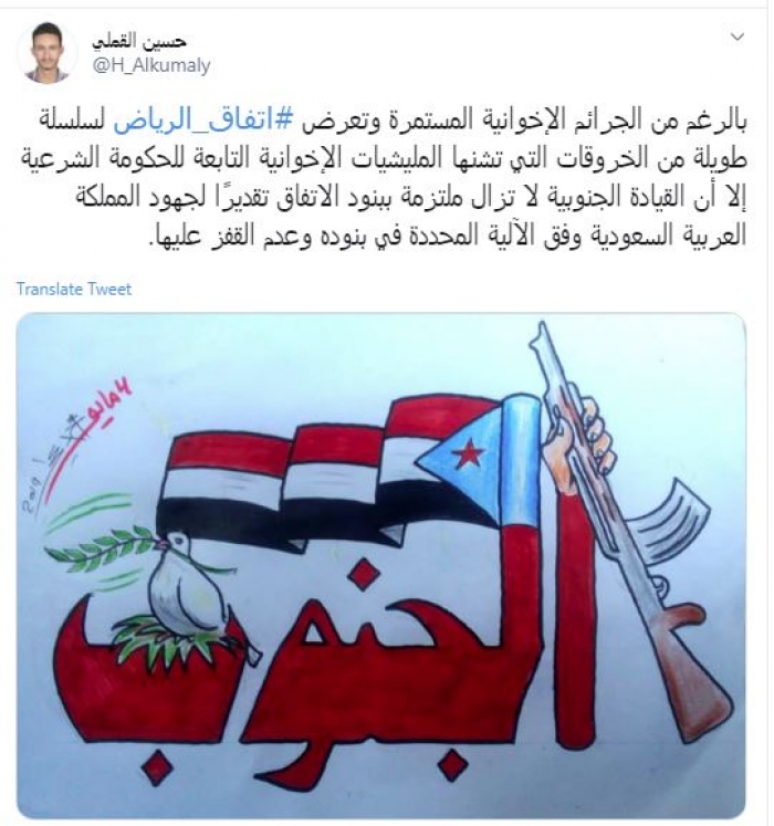 وكتب في تغريدة عبر "تويتر" رصدها "المشهد العربي": "بالرغم من الجرائم الإخوانية المستمرة وتعرض اتفاق الرياض لسلسلة طويلة من الخروقات التي تشنها المليشيات الإخوانية التابعة للحكومة الشرعية إلا أن القيادة الجنوبية لا تزال ملتزمة ببنود الاتفاق تقديرًا لجهود المملكة العربية السعودية وفق الآلية المحددة في بنوده وعدم القفز عليها".