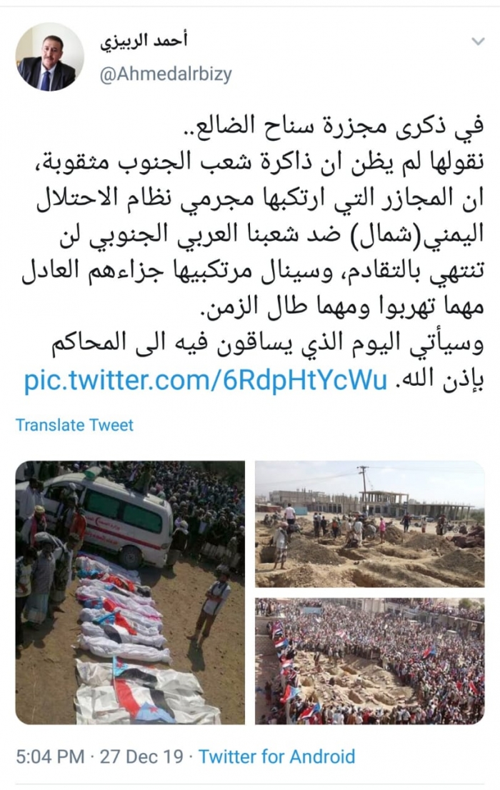 وكتب الربيزي، في تغريدة له على موقع التواصل الاجتماعي تويتر، تابعها المشهد العربي: "في ذكرى مجزرة سناح الضالع.. نقولها لمن يظن أن ذاكرة شعب الجنوب مثقوبة".