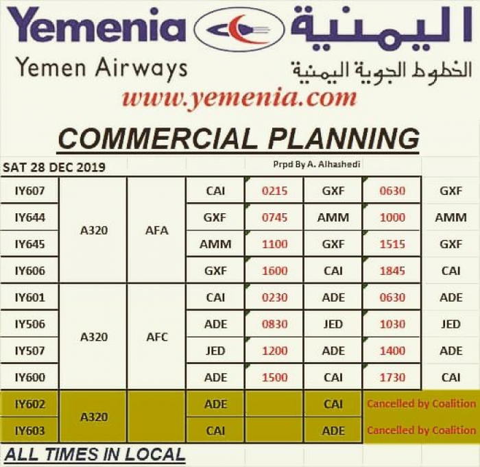 وينشر المشهد العربي، لقرائه جدول مواعيد ورحلات طيران اليمنية المقررة غدا الموافق 28 ديسبر 2019.