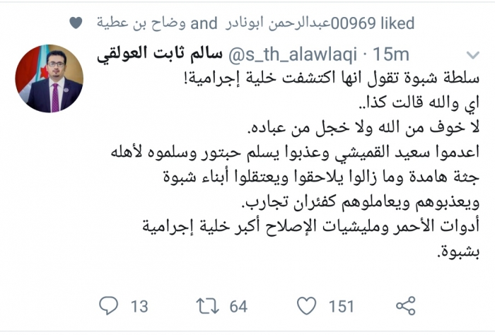 وكتب العولقي، في تغريدة له على موقع التواصل الاجتماعي تويتر، تابعها المشهد العربي، ساخرا: "سلطة شبوة تقول إنها اكتشفت خلية إجرامية"، مضيفا: "لا خوف من الله ولا خجل من عباده".
