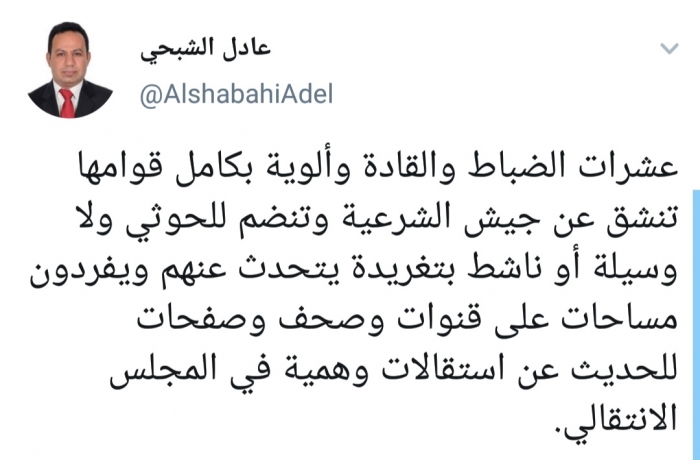 وكتب الشبحي، في تغريدة له على موقع التواصل الاجتماعي تويتر، تابعها المشهد العربي: "عشرات الضباط والقادة وألوية بكامل قوامها تنشق عن جيش الشرعية وتنضم للحوثي ولا وسيلة أو ناشط بتغريدة يتحدث عنهم".