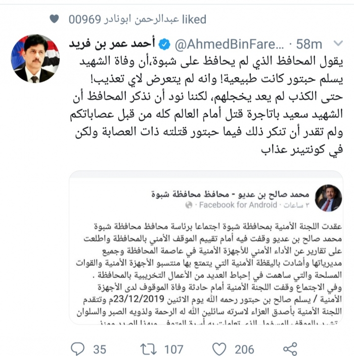 وكتب بن فريد، في تغريدة له على موقع التواصل الاجتماعي تويتر، تابعها المشهد العربي: "يقول المحافظ الذي لم يحافظ على شبوة، إن وفاة الشهيد يسلم حبتور كانت طبيعية! وأنه لم يتعرض لأي تعذيب".