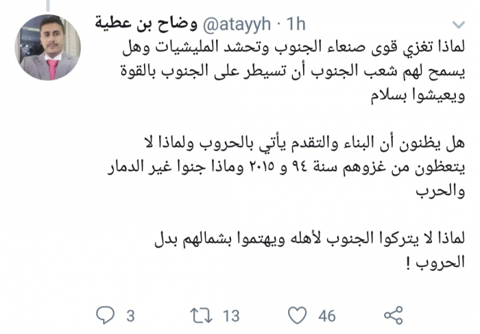 وكتب بن عطية، في تغريدة له على موقع التواصل الاجتماعي تويتر، تابعها المشهد العربي: "لماذا تغزي قوى صنعاء الجنوب وتحشد المليشيات، وهل يسمح لهم شعب الجنوب أن تسيطر على الجنوب بالقوة ويعيشوا بسلام؟".