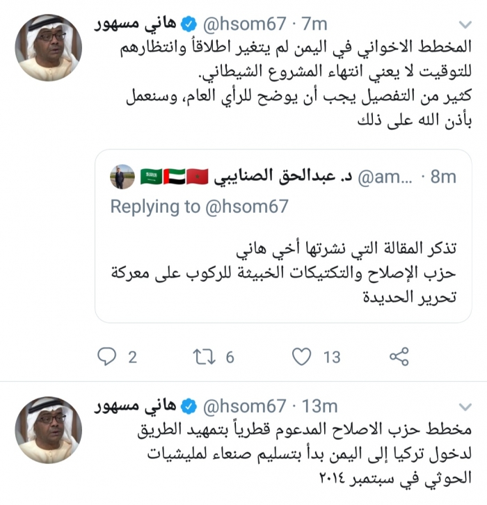 وكتب مسهور، في تغريدة له على موقع التواصل الاجتماعي تويتر، تابعها المشهد العربي: "مخطط حزب الإصلاح المدعوم قطرياً بتمهيد الطريق لدخول تركيا إلى اليمن بدأ بتسليم صنعاء لمليشيات الحوثي في سبتمبر ٢٠١٤".